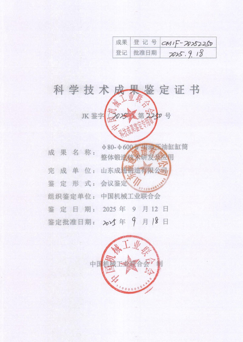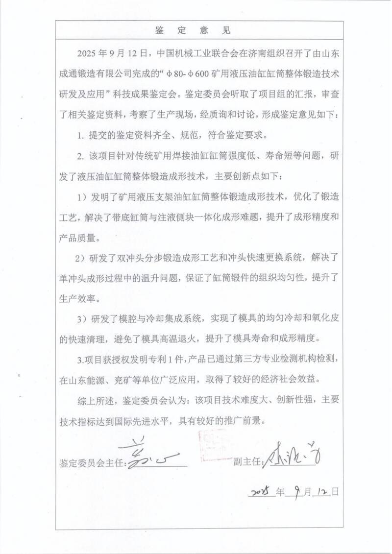 2025年9月12日,由我公司完成的“φ80-φ600矿用液压油缸缸筒整体锻造技术研发及应用”通过国家级成果鉴定。该项目突破矿用液压油缸缸筒传统制造工艺瓶颈,解决国内依赖“分段锻造+焊接”导致的焊缝强度不足、可靠性低等问题,打破国外对整体锻造技术的垄断。